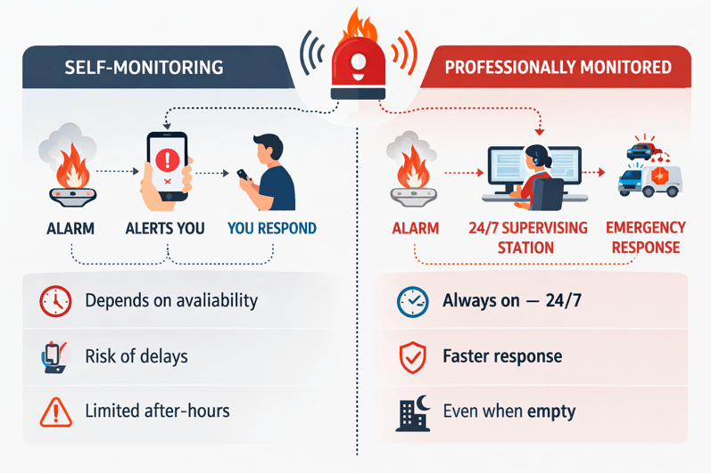 Self-monitoring typically means signals and notifications go only to you or your team through an app, text, or call list. There is no staffed supervising station receiving and acting on those signals around the clock.